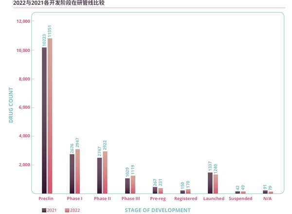 圖2 2021年與2022年各開發階段在研管線比較(Informa Pharmaprojects, 2022年1月)